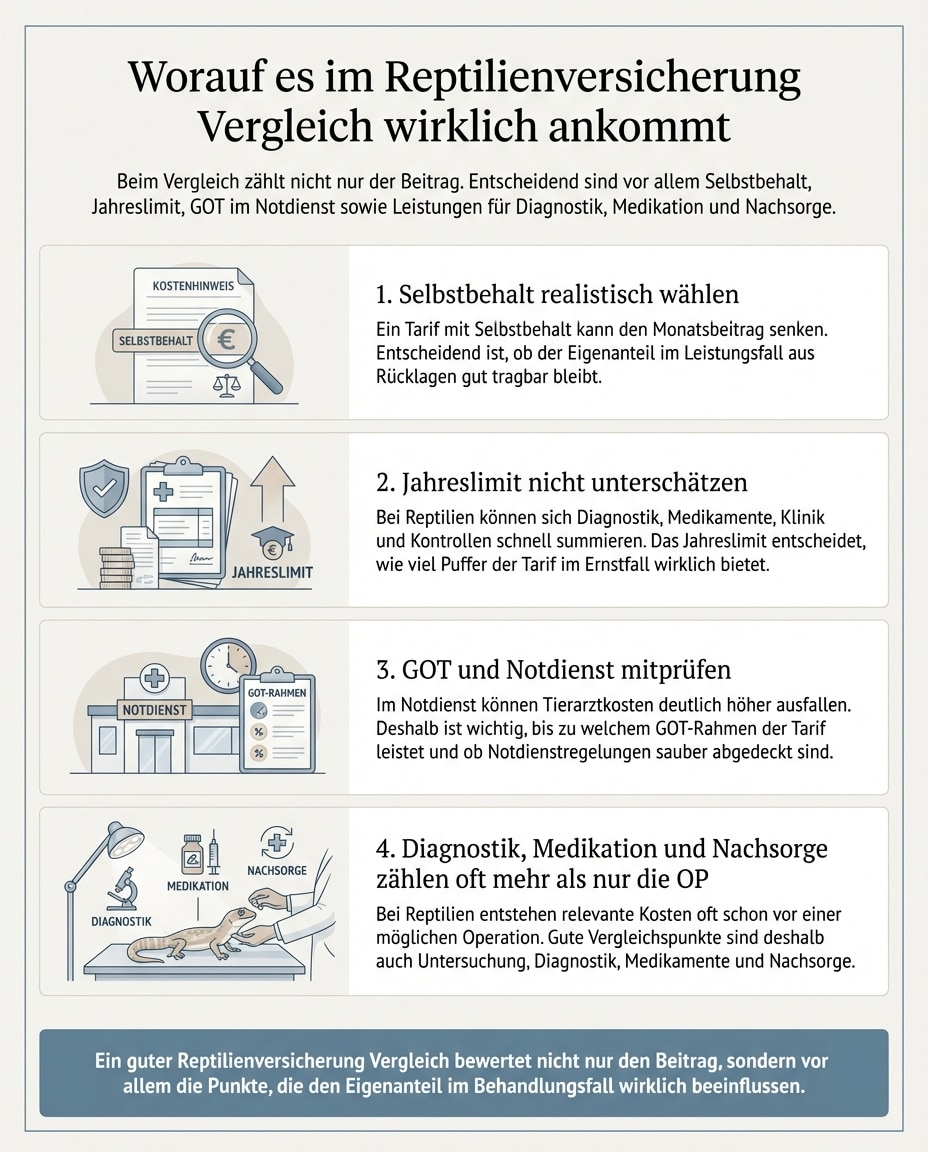 Bei Reptilien entscheidet oft das Gesamtpaket aus SB, Limit, GOT/Notdienst und Nachsorge – nicht ein kleiner Beitragsunterschied.